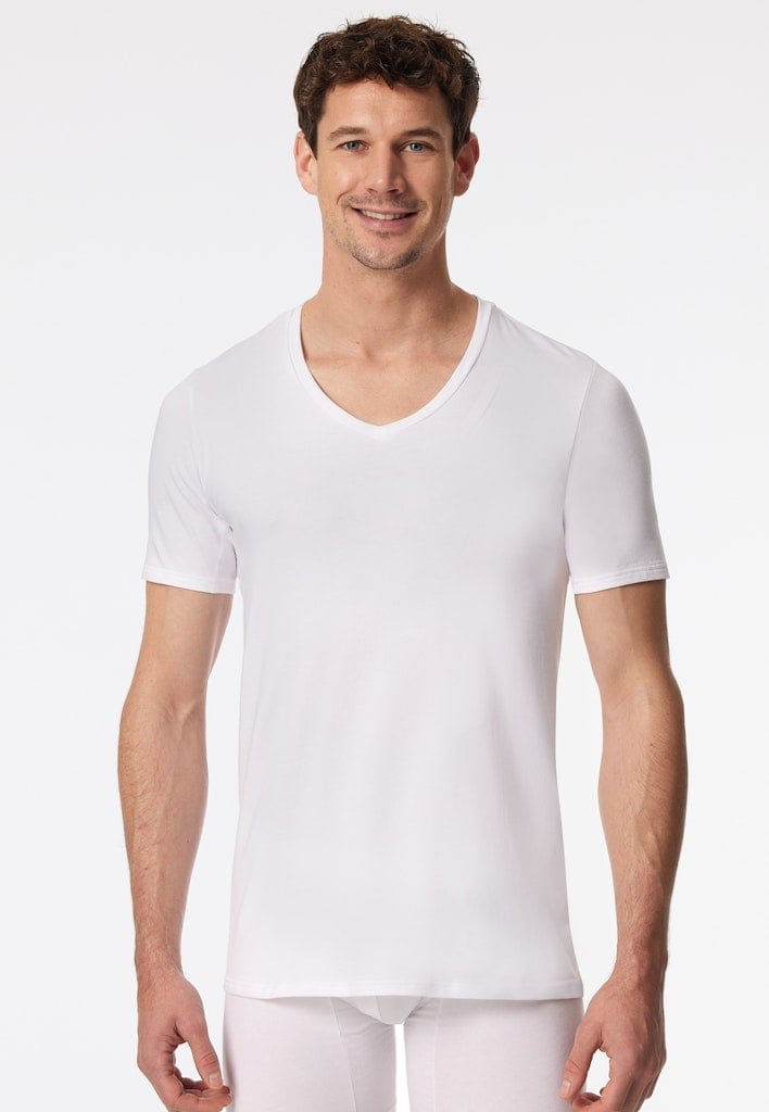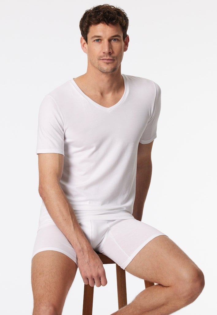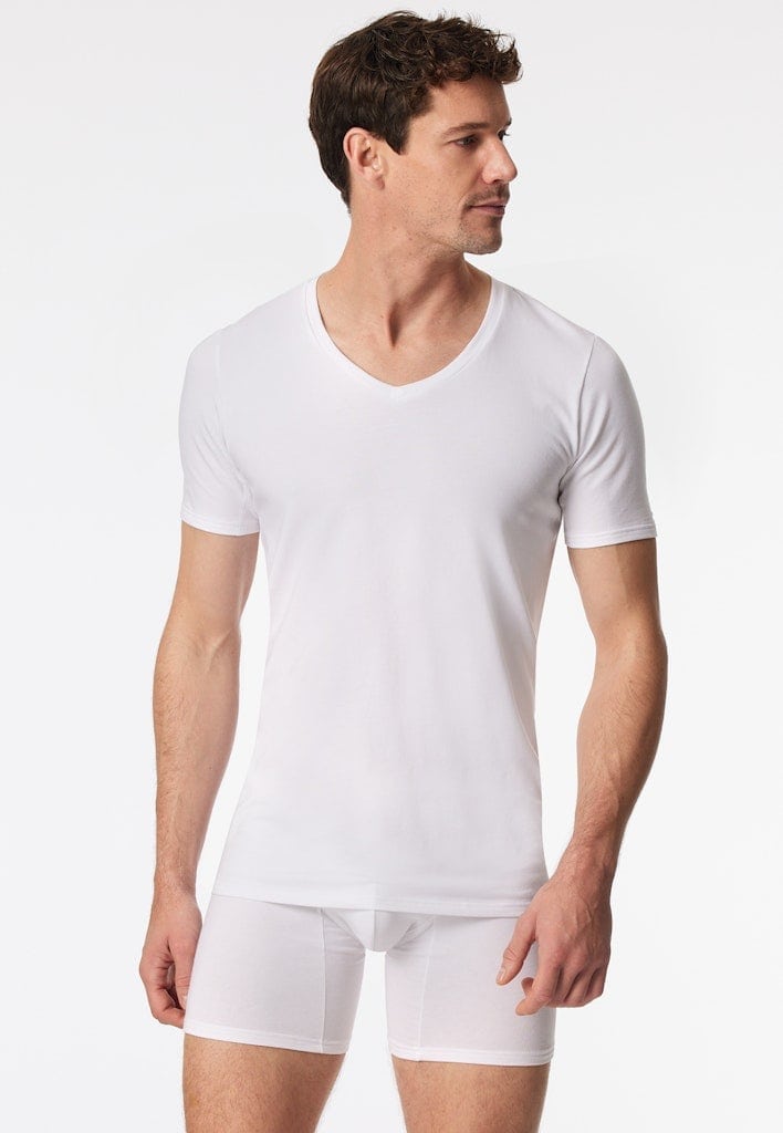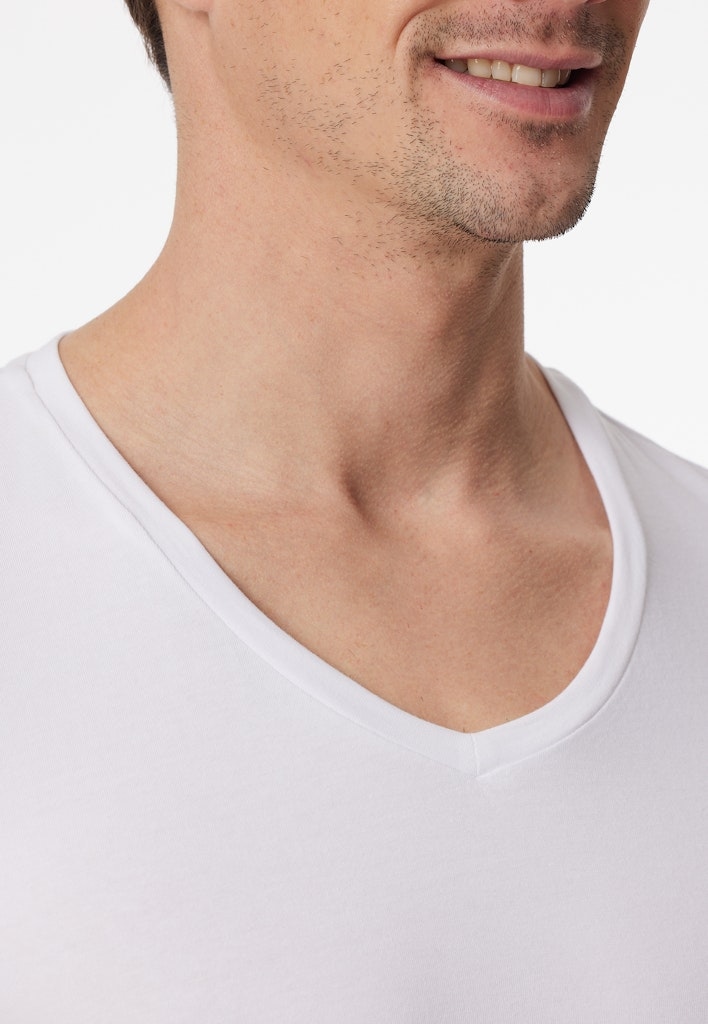 weißes Kurzarmshirt für Herren mit V-Ausschnitt, aus der SCHIESSER Serie "Premium Cotton", strategisch platzierte Veredelung unter dem Arm , minimiert das Abzeichnen von Feuchtigkeit dank hydrophiler/hydrophober Veredelung, wasch- und trocknerfest, hoher Komfort dank Tamponprint und flacher Seitennähte, in hochwertiger, elastischer Single-Jersey-Qualität