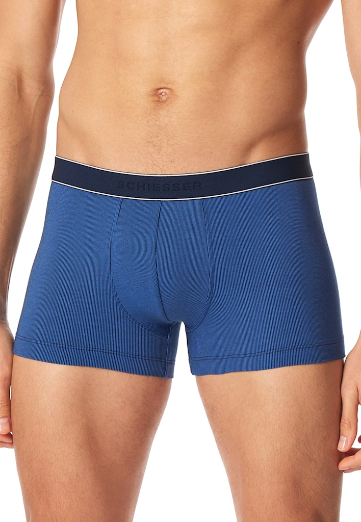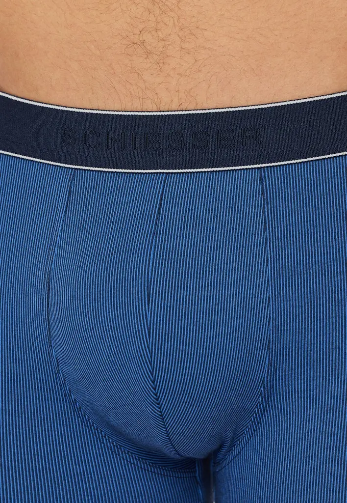 dunkelblau gestreifte Herrenshorts, aus der SCHIESSER Serie "Duality Function", farblich abgesetzter Webgummibund mit zwei weißen Streifen und SCHIESSER Aufdruck, temperatur- und feuchtigkeitsregulierend dank innovativer Hohlraum-Technologie, besonders atmungsaktives und schnelltrocknendes Material, unsere Models tragen Größe [50/M], in perfekt sitzender, elastischer Single-Jersey-Qualität mit 30 % Modal